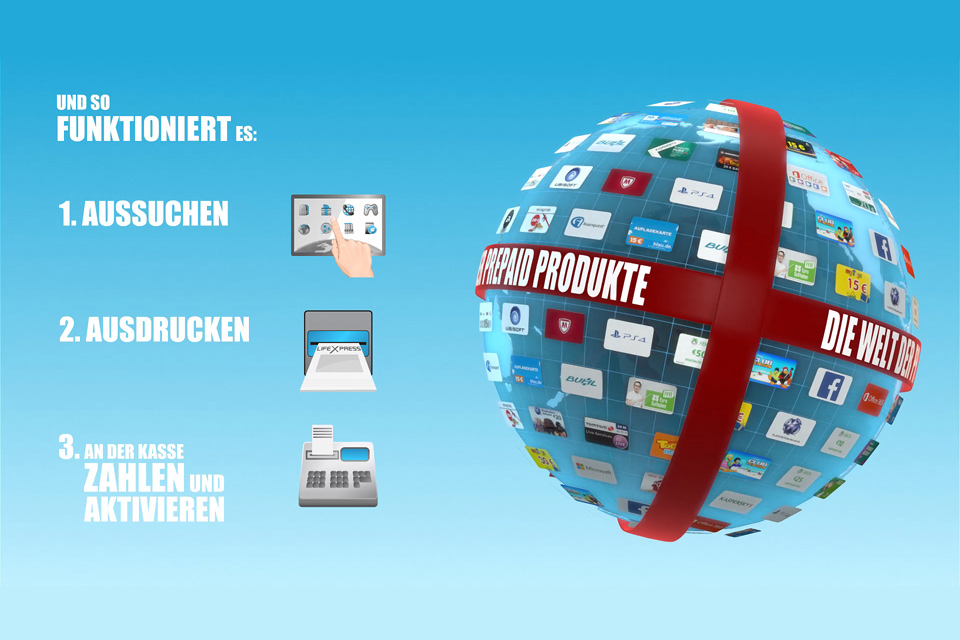 Nach dem Motto "Die Welt der Prepaid Produkte" sollte eine Endlos-Animation erstellt werden, die den Nutzer inspiriert den Terminal zu nutzen und gleichzeitig die Funtionen erklärt.