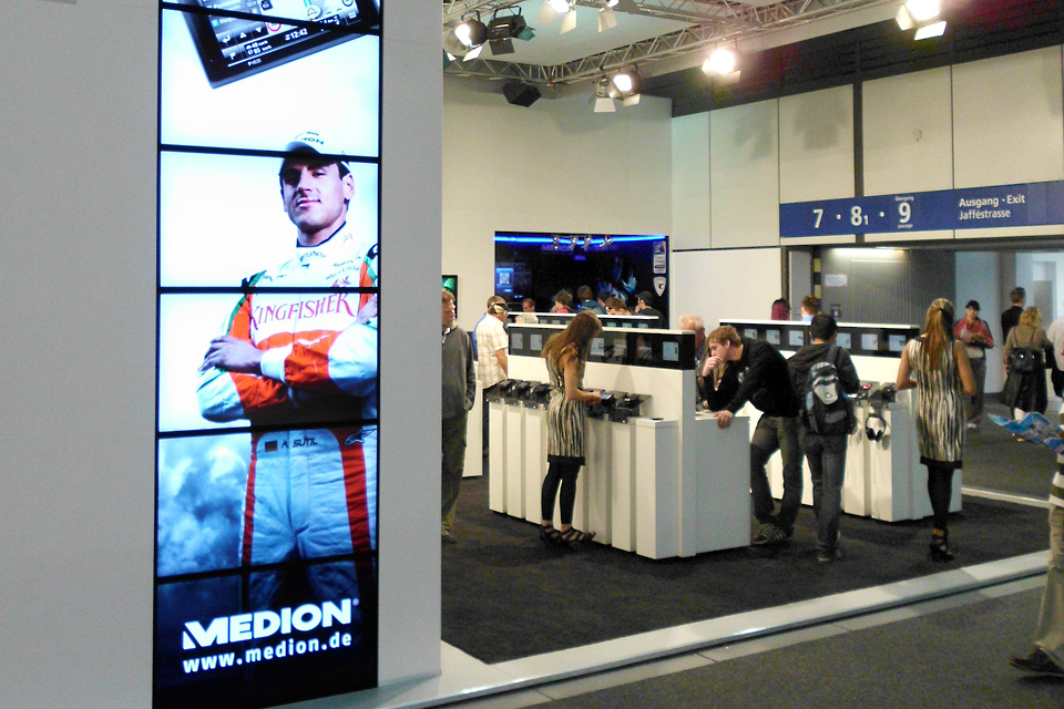 Auf der IFA 2010 mussten verschiedene Projektionsflächen animiert werden. Die größte Herrausforderung dabei war eine Animation über 7 vertikal angeordnete Fernseher, auf denen eine gefilmte Paternoster Szene abgespielt werden sollte.